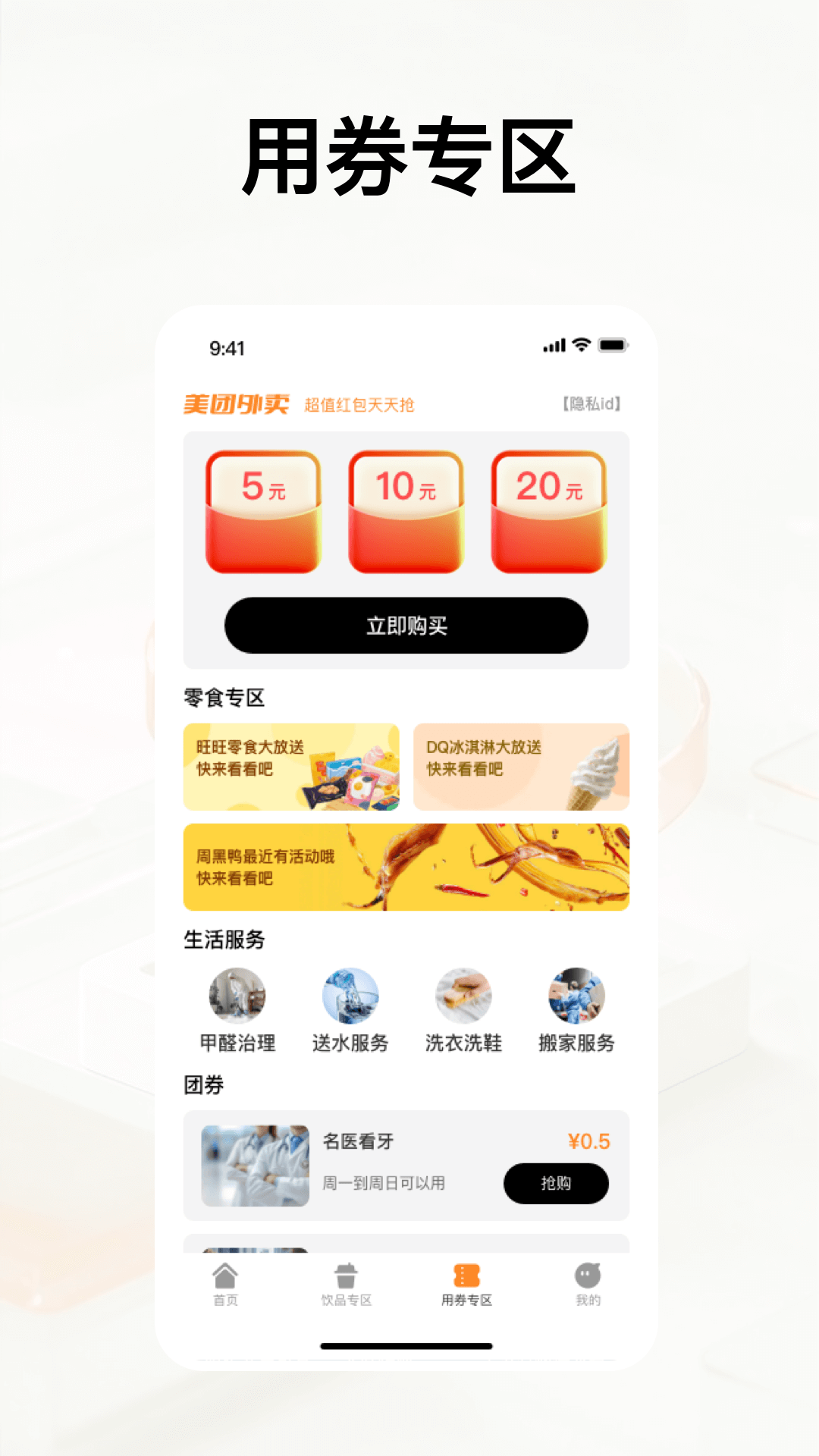 拥有外卖优惠券,美团、饿了么红包券,奶茶、正餐、水果闭眼省!首页有精选大牌供你选择,还在为不会省钱担忧吗,来看省钱攻略,并且有用券专区 轻松找到零食区,饮品区,生活服务区,团购服务,打工人、学生党速冲!干饭人必备省钱神器!