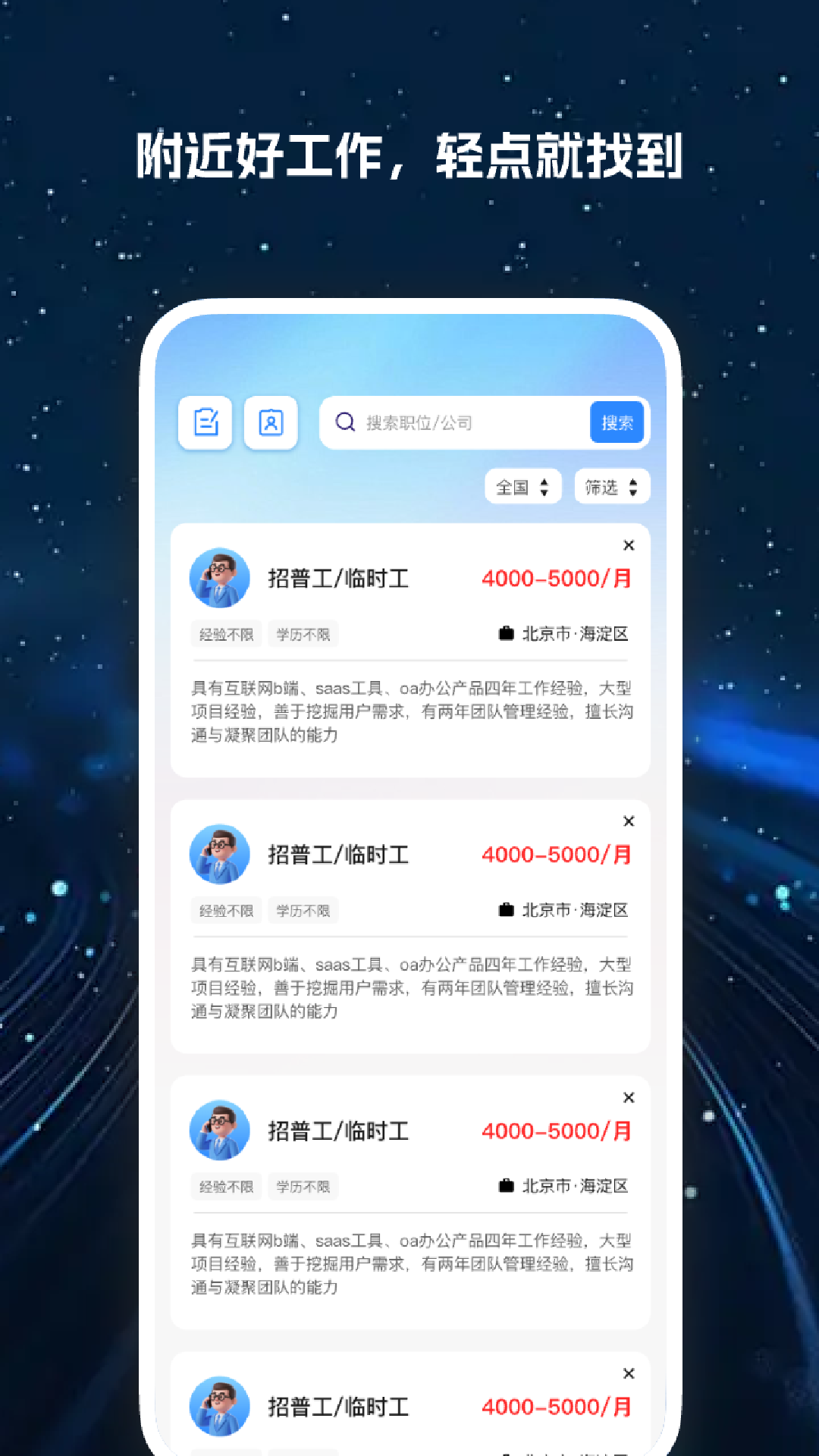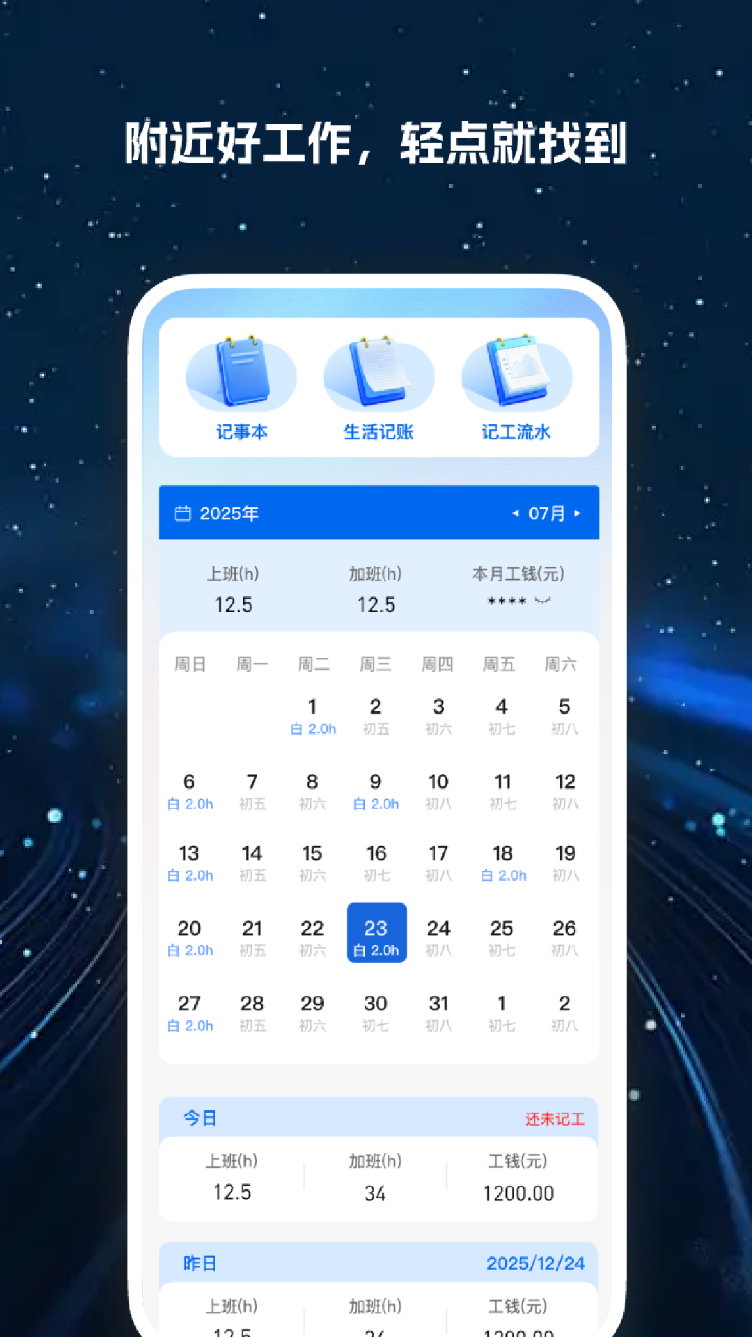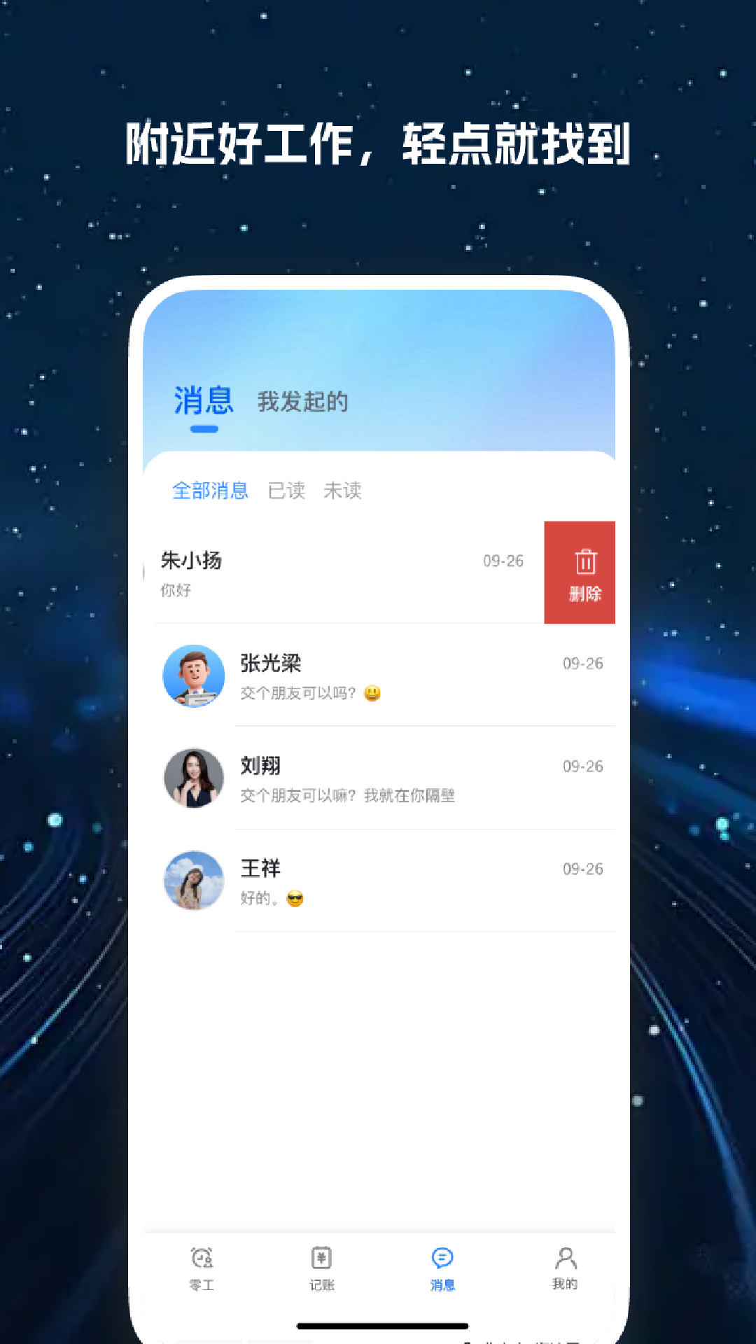 打工人和招工方的实用工具。打工人能快速找日结零工、记工记账;招工方能发布岗位、管理招聘。消息实时通,收支、岗位都能在 “我的” 里清晰管理,轻松对接零工需求。